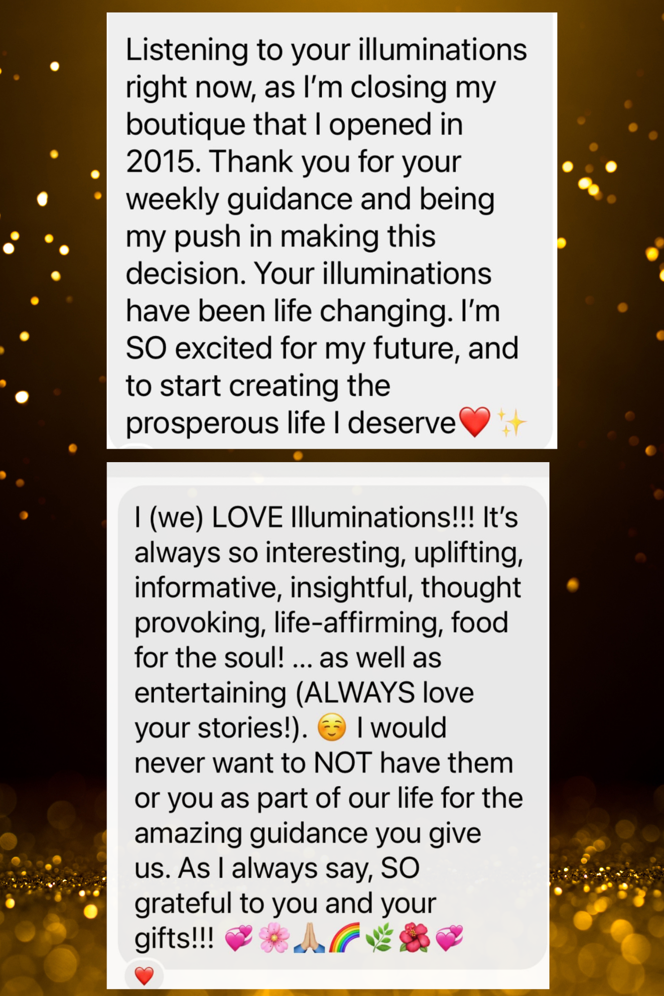 Illuminations was my first purchase just over three years ago. It was the catalyst to massive change in the way I think. Thank you Liana. And the clearings and prayers in Illuminations are life saving.